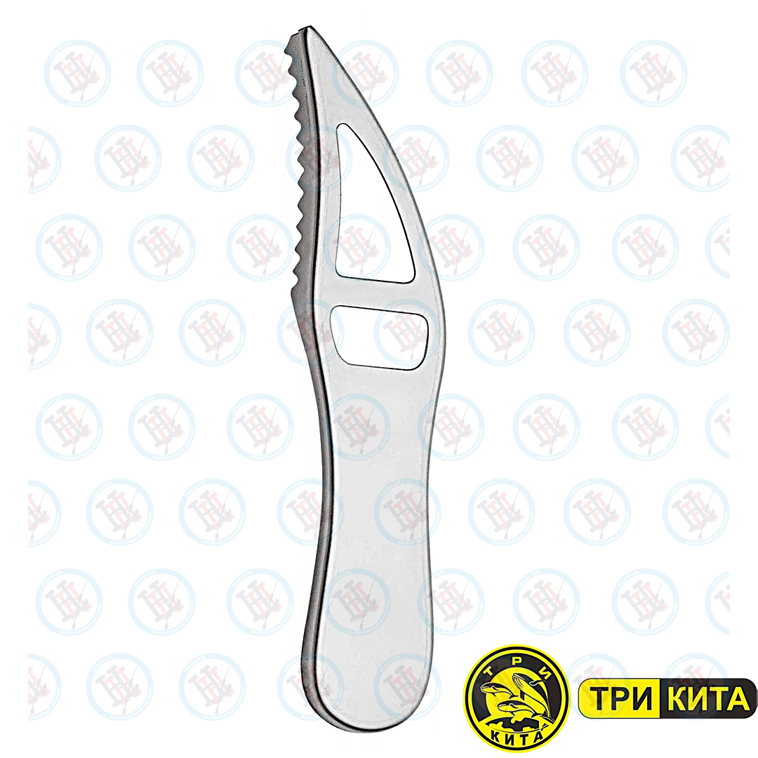 Рыбочистка "Три Кита" проста и удобна в использовании. Её конструкция с острыми зубцами и зауженным носом позволяет быстро снимать чешую с крупной рыбы. Рукоятка имеет эргономичную форму.