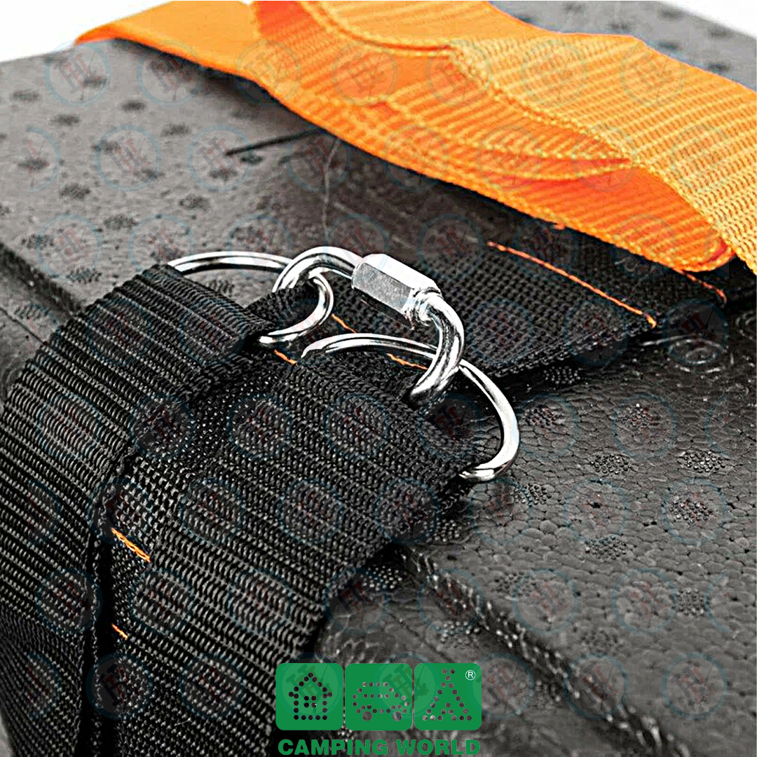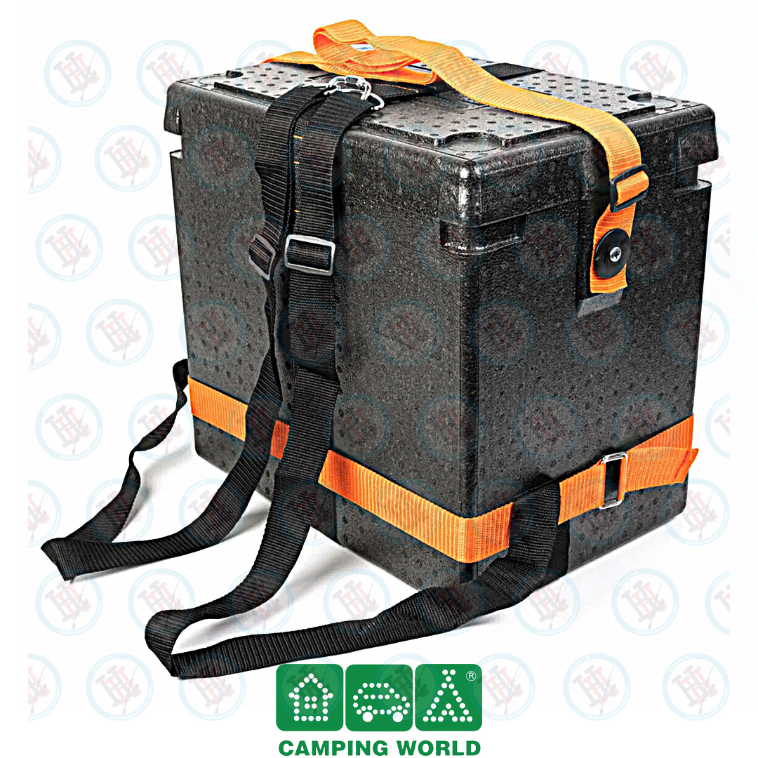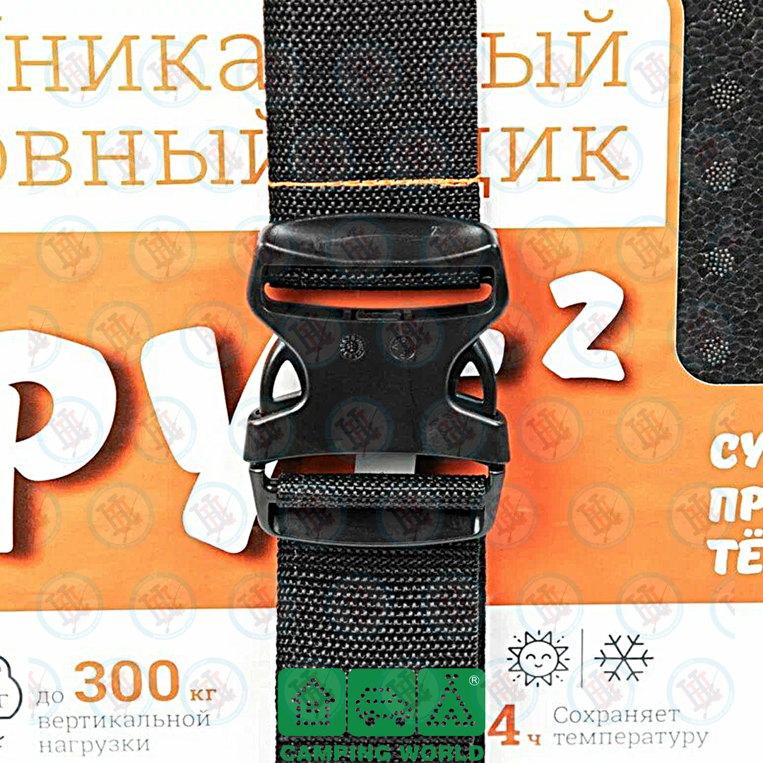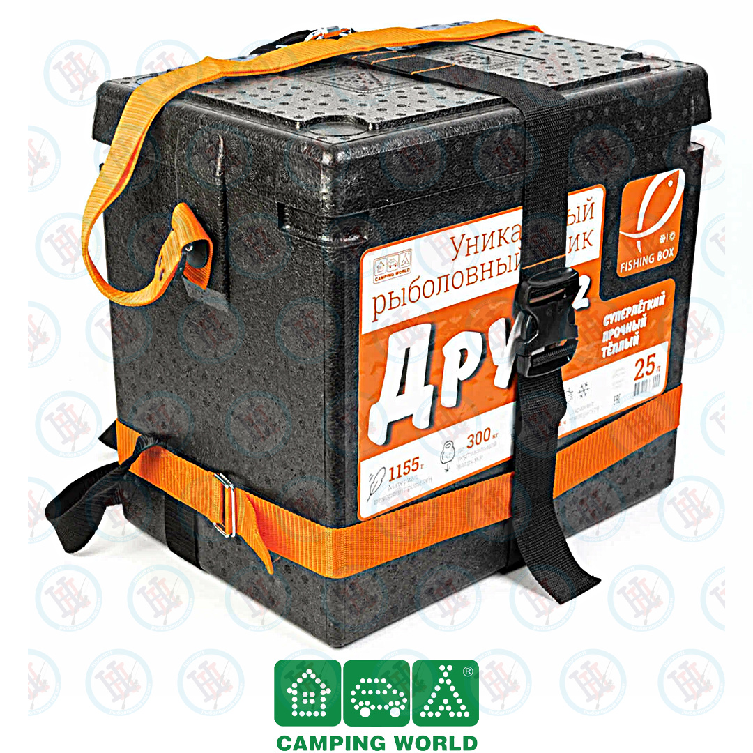 Рюкзак-обвязка для ящика «Друг 2» – собственная запатентованная разработка компании «Кемпинг 2000». Создана рыбаками для рыбаков. Представляет собой простую, но очень прочную систему из двух синтетических строп, которая легко превращает ящик в заплечную сумку. Система весит всего 80 граммов и не утяжеляет ящик. Крепится быстро, без какого-либо дополнительного оборудования. Ящик не надо будет сверлить, дырявить или смазывать клеем. Просто обвяжите вокруг него стропы и носите на спине. Основная широкая (50 мм) черная стропа берет на себя всю весовую нагрузку.